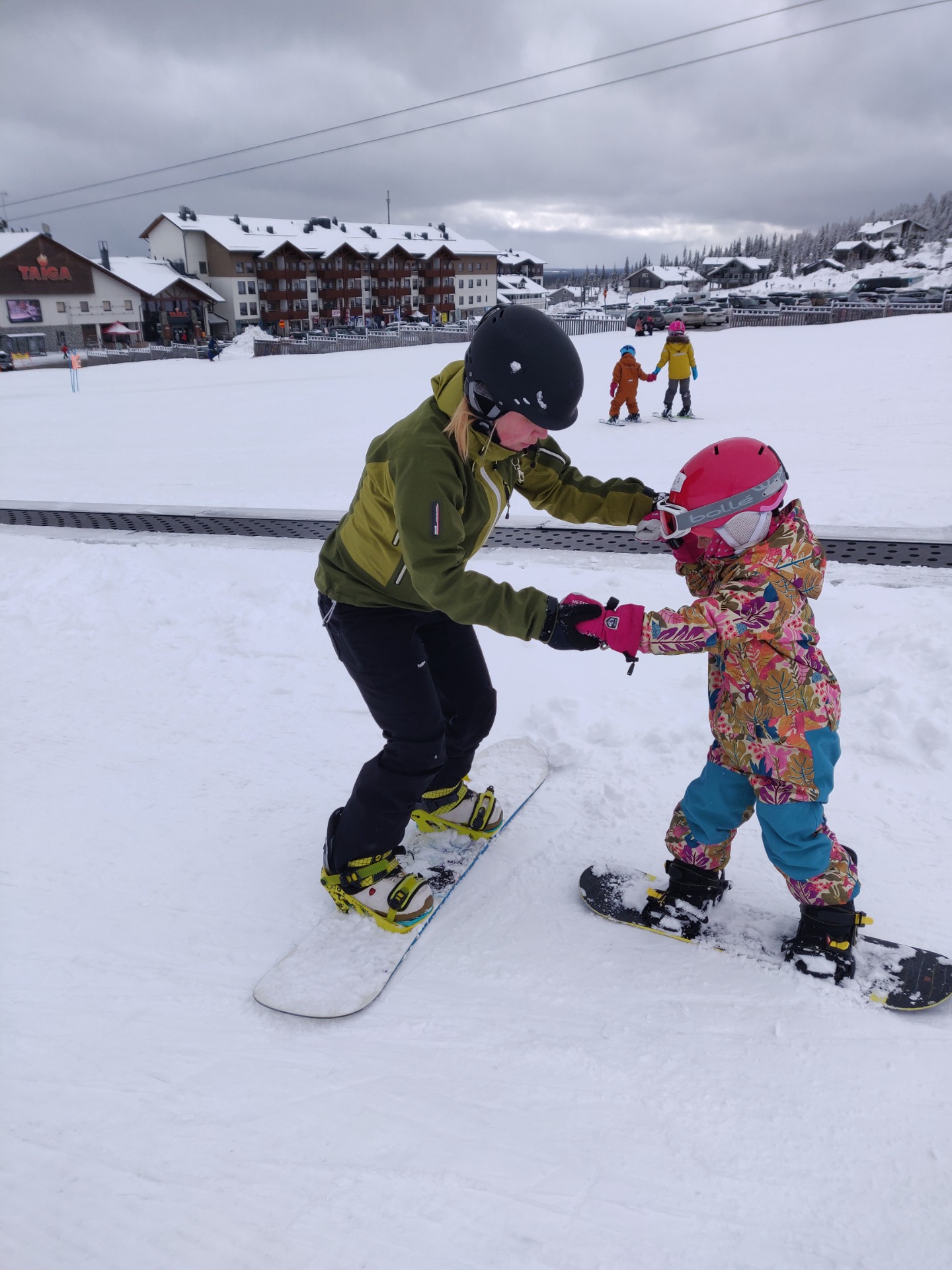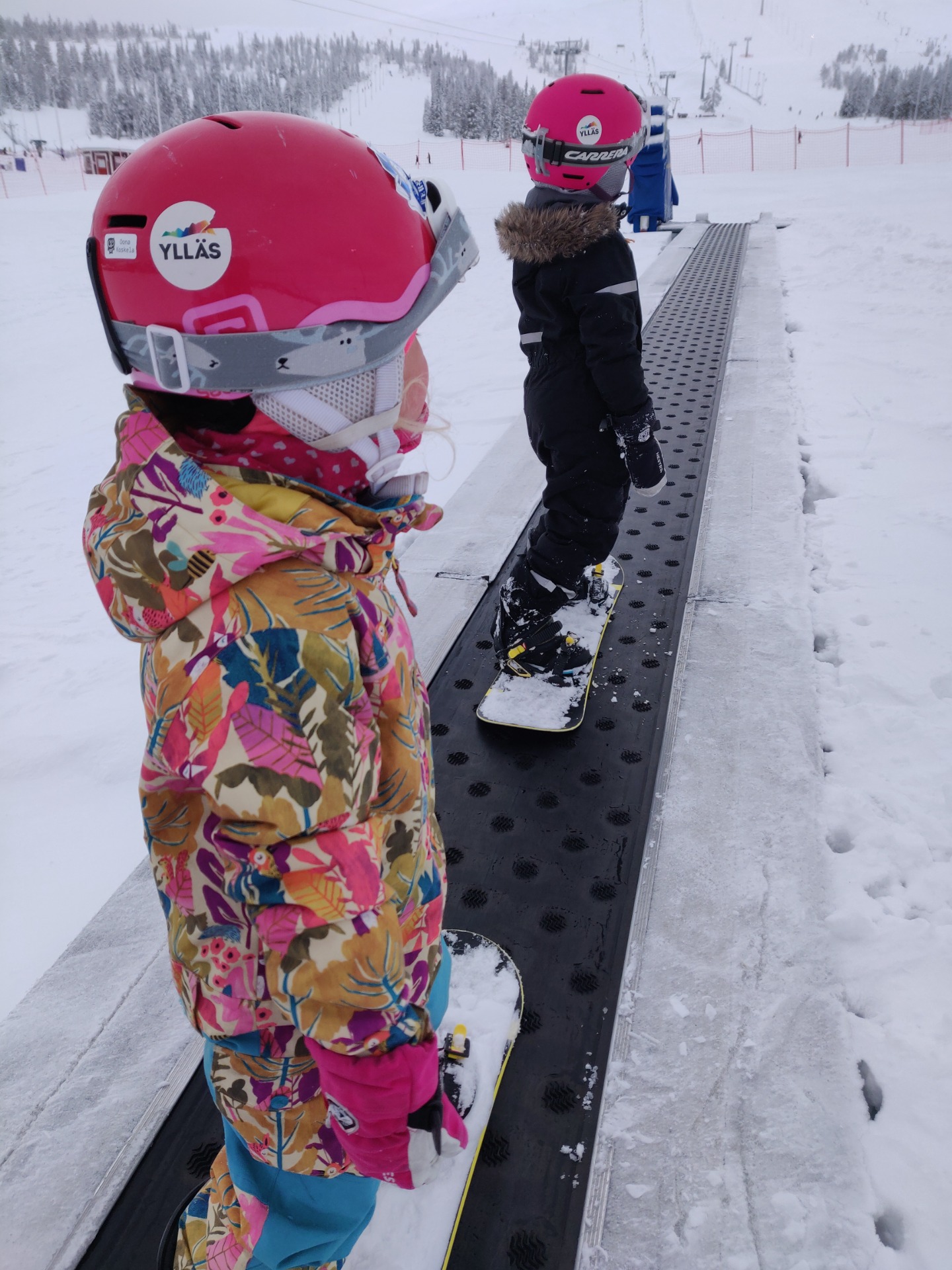 Kohta 5 vuotta täyttävä kuopus ja 6 vuotias esikoiseni päättivät lähteä suksien sijaan lumilaudoilla mäkeen. Huipun ja gondolihissin sijaan tiedossa oli päivä mäenjuurella mattohissillä. Päivä aloitettiin siis vuokraamosta, jotta oikeat välineet saatiin hankituksi ja ei muuta kuin MÄKEEN! Ensimmäisellä nousulla lauta vielä leppoisasti käsissä.